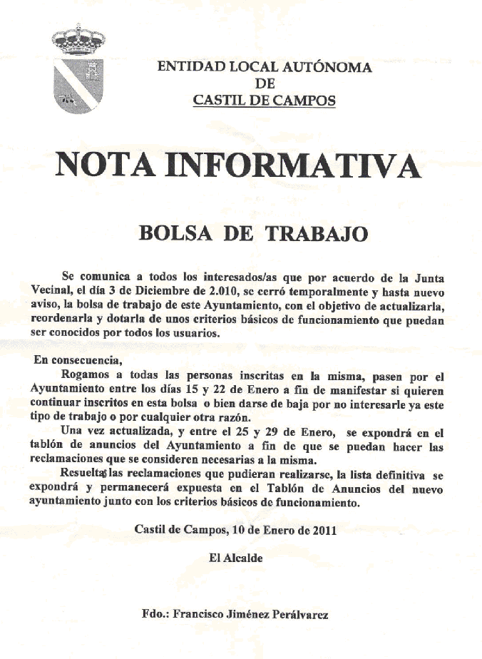 -La Entidad Local Autónoma de Castil de Campos ha hecho pública con fecha 10 de enero de 2011 la siguiente Nota Informativa referente a la bolsa de trabajo del Ayuntamiento, así como las nuevas bases reguladoras de la misma: