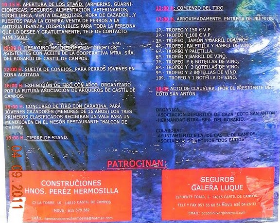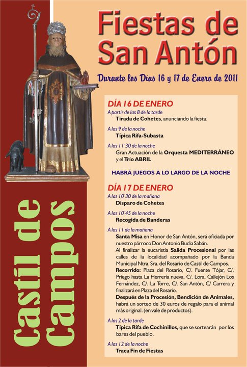 -El domingo 9 de enero la Hermandad de San Antón de Castil de Campos pedía por las casas del pueblo. A continuación insertamos el programa de actos y actividades de San Antón 2011. La Hermandad de San Antón recuerda que en la rifa-subasta se puede colaborar llevando a la Peña el típico testuzo, el plato que más le guste, el mejor dulce, o lo que le apetezca... San Antón se lo agradecerá.