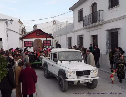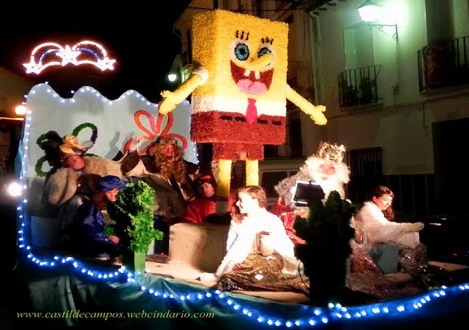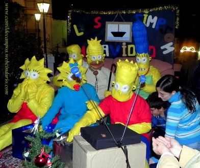 El lunes dos de enero a las ocho de la tarde estaba anunciada en el Programa Navideño del Ayuntamiento matriz la recepción de los Reyes Magos de Priego en la Plaza del Rosario, para recoger las cartas de los niños y niñas de Castil de Campos, pero según me cuentan, éste año no se presentaron. Los que si se presentaron el día 5 por la noche, fueron los Reyes Magos de Campos, encarnados por Manolo Sánchez (Melchor), José Pérez (Gaspar) y David Ruiz (Baltasar). Llegaron de Oriente en una carroza elaborada por el personal del Ayuntamiento, precedida por los pajes y demás comitiva, tirada por el tractor de José el de Rosaura y decorada por Mari Rosa Ruiz y sus colaboradoras/es, con un simpático Bob Esponja -protagonista de una de las series de dibujos animados con más éxito del momento entre los mas pequeños- que fue recibiendo a los niños y niñas con sus brazos abiertos. La cabalgata contó así mismo con una segunda carroza, decorada por la Hermandad de la Cruz y los vecinos del barrio del otro ejido, arrastrada por el todo terreno de Francisco Jiménez, con los protagonistas de otra famosa serie de dibujos animados, en este caso para los no tan jóvenes, nos estamos refiriendo a los Simpson: Homer, Marge, Bart, Lisa, Maggie, y al abuelo de los Simpson.