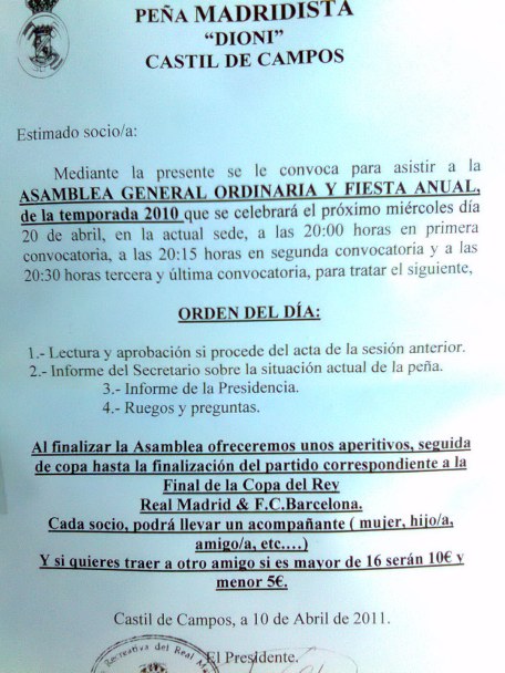 -La Peña Madridista "Dioni" de Castil de Campos convoca Asamblea General Ordinaria y Fiesta Anual para el próximo miércoles 20 de abril en la actual sede, a las 20,30 horas en 3ª y última convocatoria, con el siguiente Orden del día: