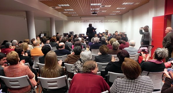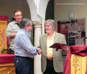 Antes de finalizar el concierto, Francisco Ruiz, en representación del Ayuntamiento de Castil de Campos, entregó a Justo Muñoz Moral, componente de la Banda que se retira por motivos de salud y edad, una pequeña placa con un saxofón en miniatura y una dedicatoria, en agradecimiento por su participación en la Banda de su pueblo y para que le sirva de recuerdo de su paso por la Escuela y la Banda de Música de Castil de Campos, Banda a la que ha pertenecido desde que dio su primer concierto en el local de La Peña, allá por el año 2003. Durante éste pequeño homenaje, Francisco Ruiz se refirió también a la larga trayectoria musical de éste saxofonista campeño, que comenzó tocando de oídas antes de que existiese la Banda, en distintas Orquestas del pueblo, como la Orquesta Perálvarez, la Orquesta Andalucía, o la que acabaría llevando su nombre, la Orquesta Muñoz, para posteriormente aprender solfeo en la Escuela de Música de Castil de Campos, y tocar en la Banda Municipal de Música de su pueblo hasta el día de hoy. Banda por cierto, que no atraviesa por sus mejores momentos, ya que de los más de cuarenta componentes que llegó a tener en sus mejores tiempos, ha ido perdiendo efectivos hasta situarse en los veinte que participaron en el último concierto.